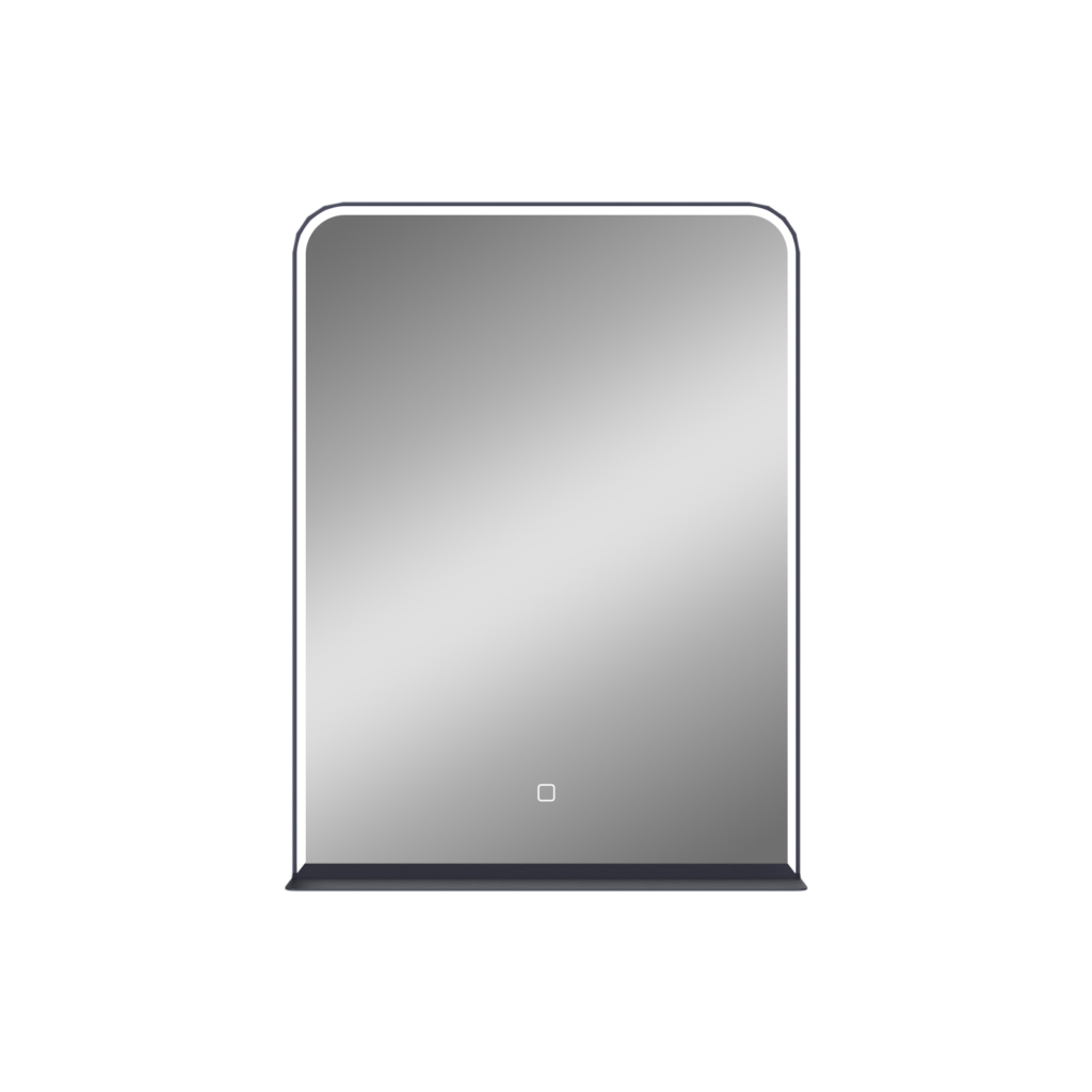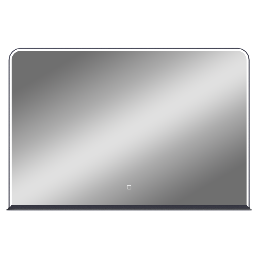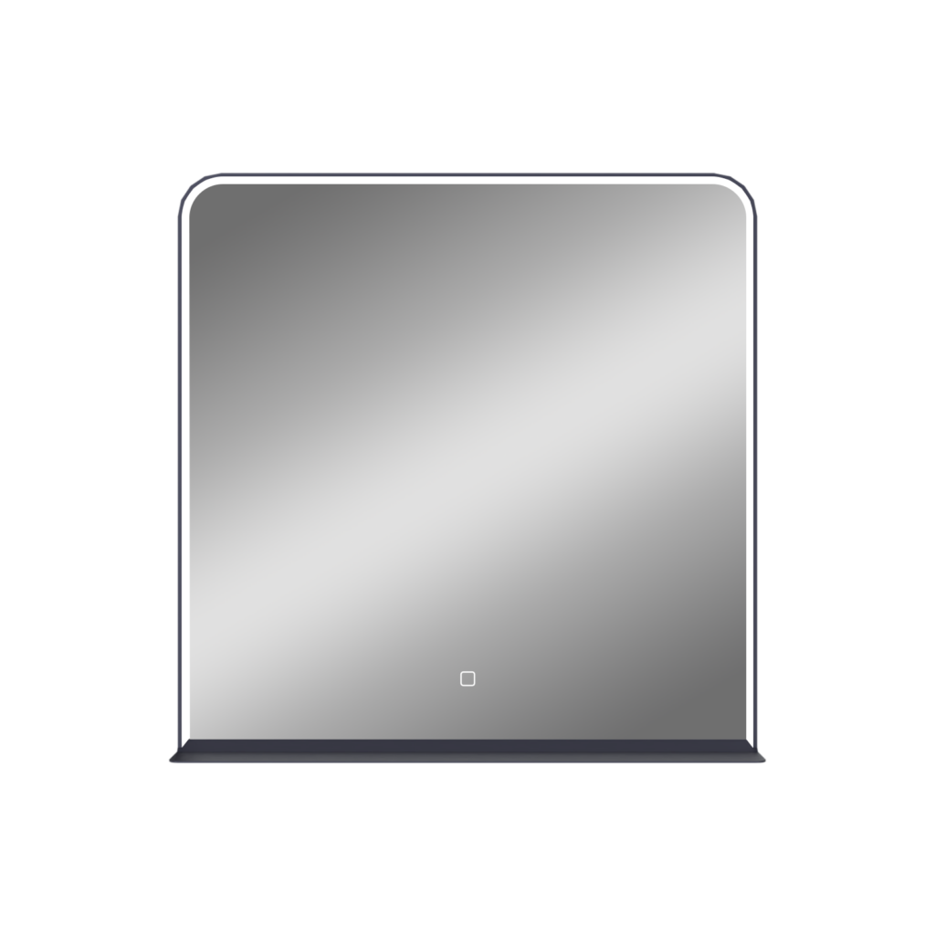 Miroirs avec un cadre aluminium noir mat, un éclairage diffusé sous un bandeau acrylique biseauté et une étagère de 10 cm